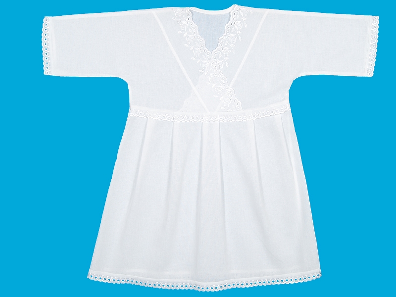 Рубашечка для крещения "Чудесные одежки" из тонкой хлопчатобумажной ткани с длинным цельнокроенным рукавом и завышенной линией талии. Перед состоит из двух частей, заходящих друг на друга и отделанных шитьем. Юбка отрезная с мягкими складками, шов соединения с юбкой, низ рукава и низ изделия отделаны узким х/б шитьем. Спинка цельнокроеная.