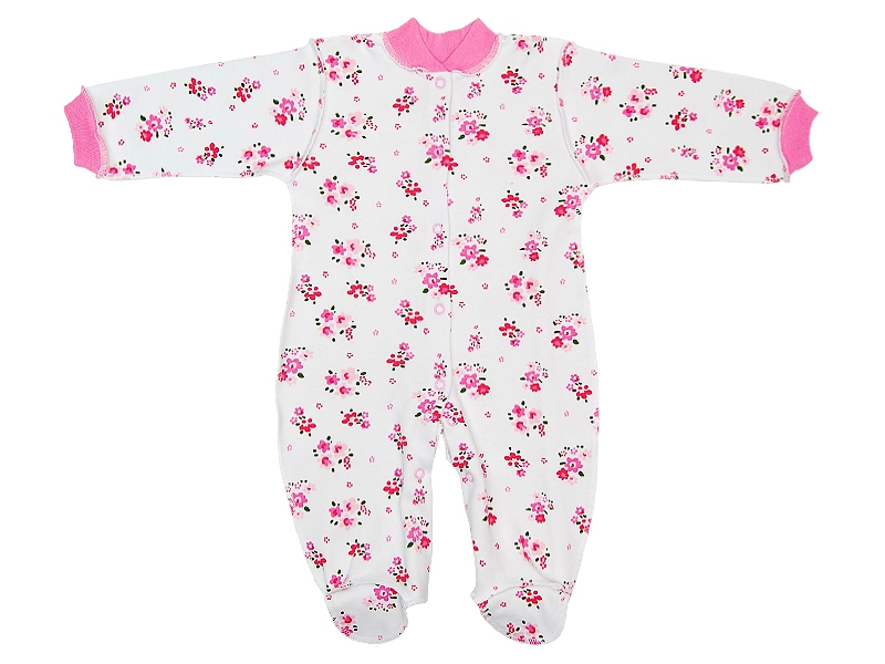 Комбинезон из трикотажного полотна (интерлок) с воротником-стойкой. Рукава длинные на манжетах, застёжка на кнопки по переду и по внутреннему шву (для удобной смены подгузника). Швы на лицевую сторону.